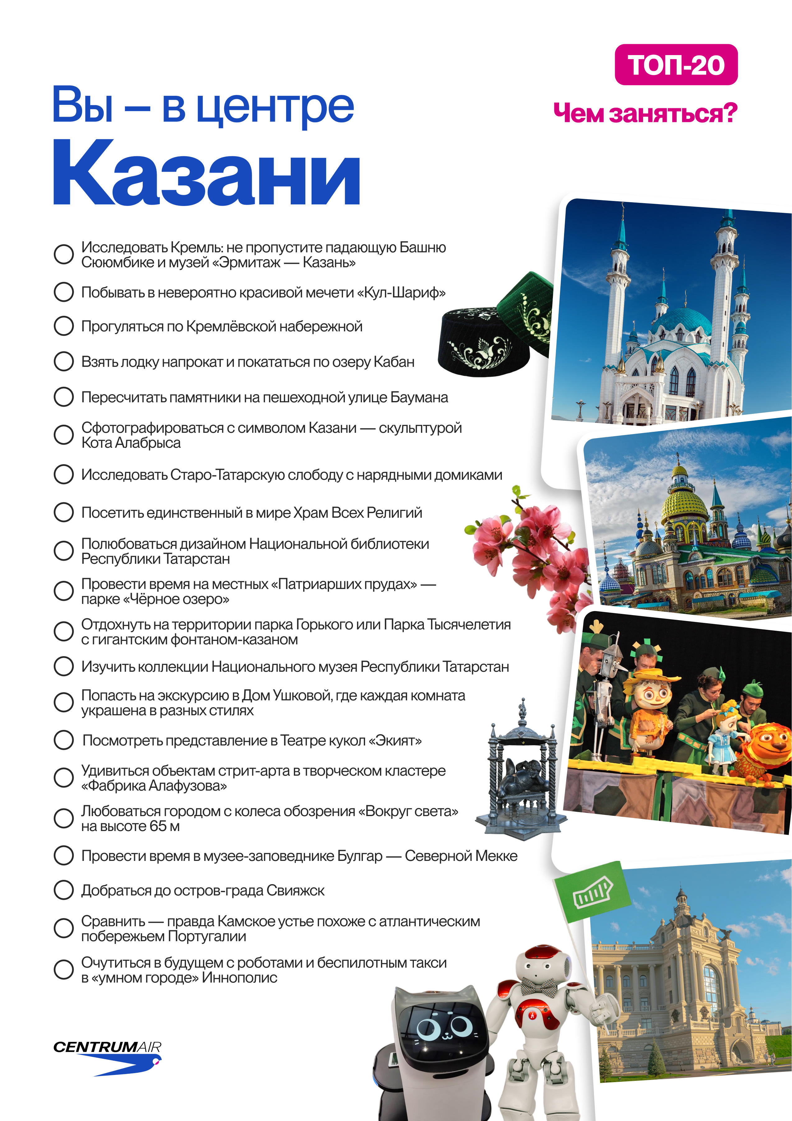 Казань читается через детали: звук шагов по старым улицам, отражения в белых стенах Кремля, запах горячей выпечки. Здесь не нужно спешить – город сам выстраивает маршрут, ведя от одной точки к другой. Этот чек-лист поможет не сбиться с ритма и прожить Казань как последовательное, насыщенное путешествие.